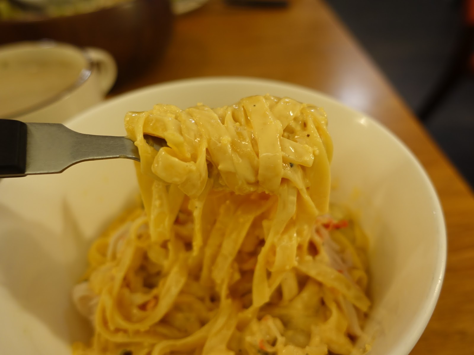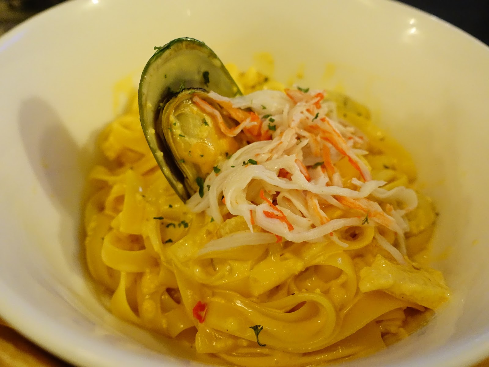 奶油明太子海鮮扁麵帶著奶油的香氣,裡頭還有蝦仁,淡菜也蠻新鮮的,吃起來很滿足!