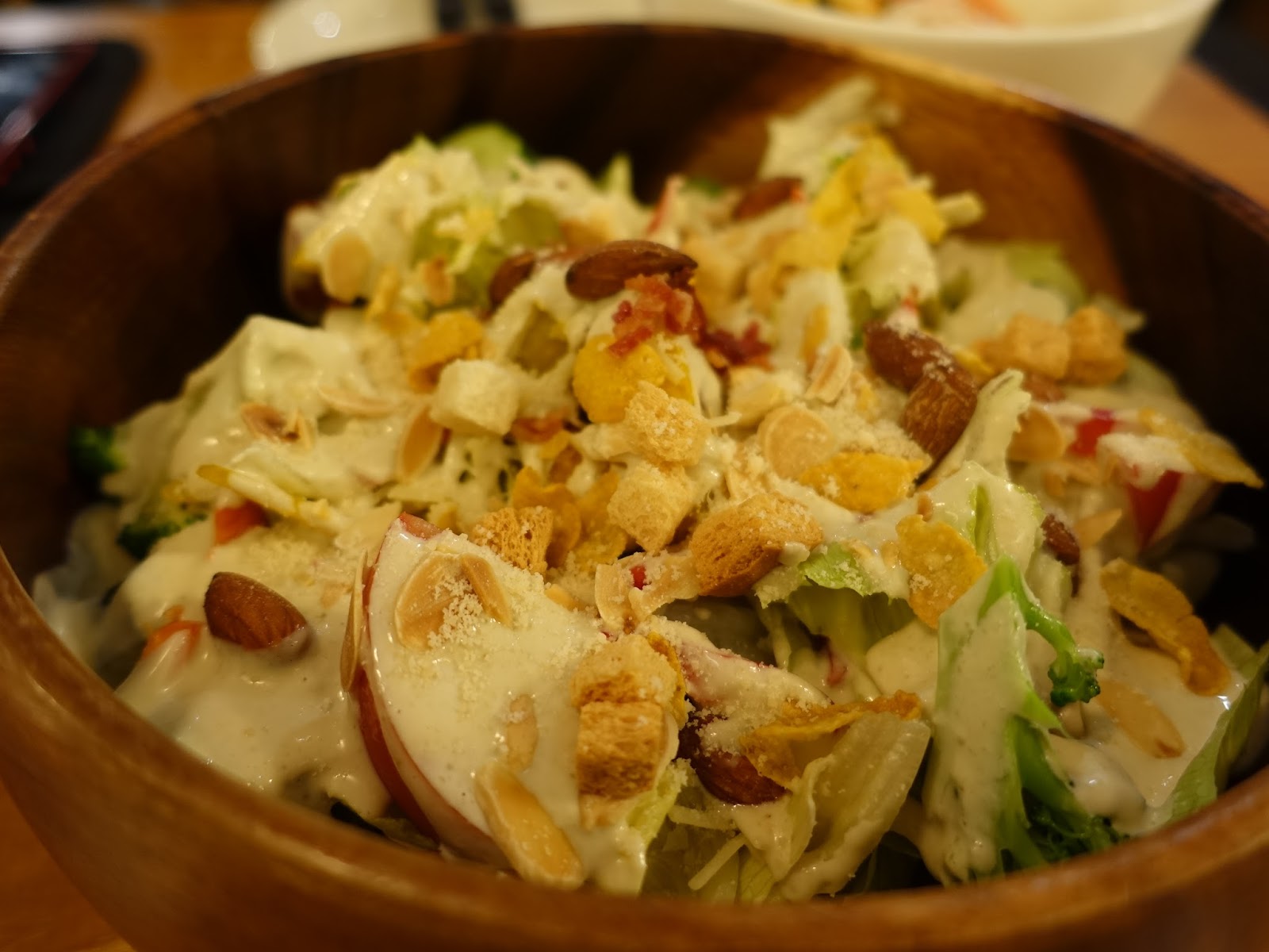 這裡的特製木碗凱薩沙拉,一個人絕對吃不完,裡頭有新鮮的蘿美心生菜和番茄、地瓜以及杏仁等核果組成,營養豐富,口感層次很好,凱薩醬拌得有點多,應該是美式的作法,醬料和味道都比較濃烈些!每一葉生菜都裹著濃厚的醬汁。