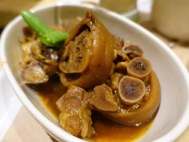 豬腳燉得相當軟透,肉質入口即化,刺蔥醬汁也很入味,吃起來很像是帶著香料味的滷豬腳。