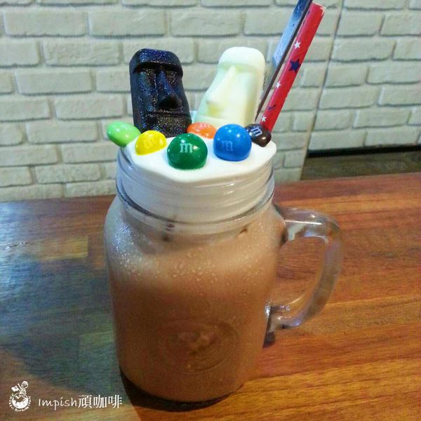 這也是可可 , 不過是冰的就沒有附巧克力湯匙了 ,倒是有巧克力做成的DUMDUM 復活島石像,以及一些MM巧克力