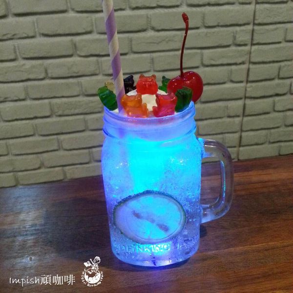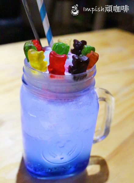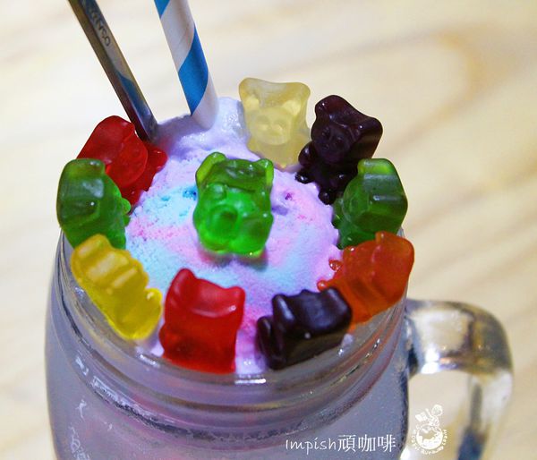 汽水頂端有放置一球繽紛的冰淇淋 (冰淇淋裡面有軟糖唷),還有圍著一圈的小熊軟糖 (是說這畫面怎麼看起來有點像在霸凌中間的綠色小熊XD)