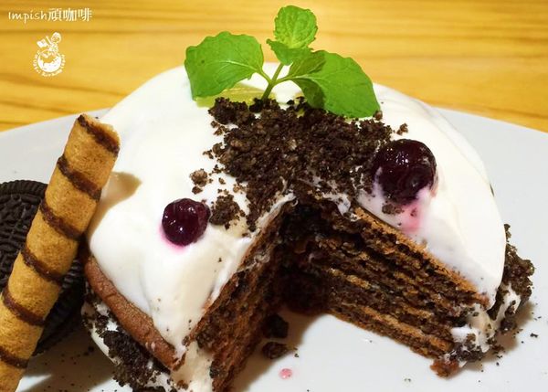 OREO美式煎餅總共有四層, 個人覺得還滿柔順好吃的 ,巧克力味道頗濃郁,搭配奶油吃天作之合來著