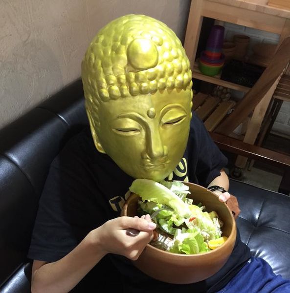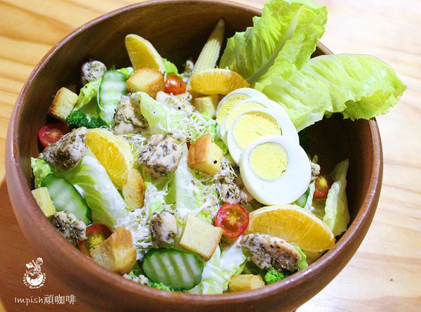 內含大量生菜、小黃瓜、水果和麵包丁等等 ,重點是木盆好大, 當木盆凱薩沙拉一登場時真是氣勢磅 礴, 彷彿見到羅馬帝國的凱薩大帝手持沙拉現身(什麼比喻!?)