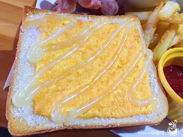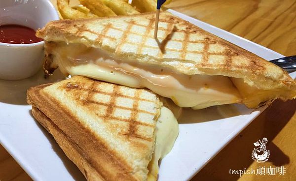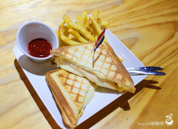 這是熱壓吐司來著 , 除了切對半的熱壓吐司外 , 還有附些許小薯。 不過個人會小建議上面的旗子圖案或許可以考慮放頑咖啡的logo,如此當客人拍照上傳網路的時候別人一看見就知道是出自頑咖啡之手 XD