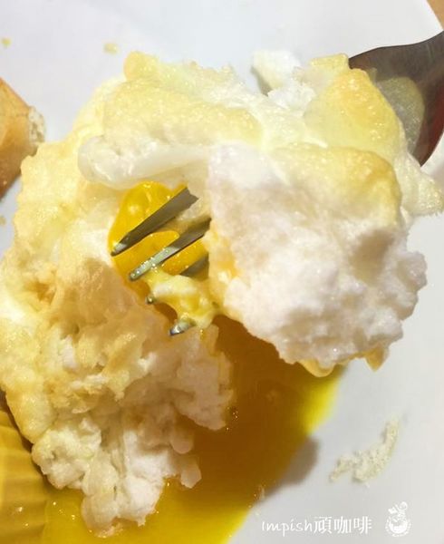 蛋是半熟蛋 , 但是如果你以為跟一般市面上的半熟蛋一樣就錯了!!!! NO~NO~NO(搖食指) 起初我也沒多加留意半熟蛋,但是當叉子一戳下去,瞬間產生奇妙的觸感,有撲滋撲滋脆脆的聲音,因為它是蛋白打發的, 有稍微烤過, 所以整個感覺很蓬鬆, 宛如雲朵一樣 。 回想此半熟蛋完好如初的模樣,就像白雲朵朵裡藏有一顆耀眼金黃色的太陽般