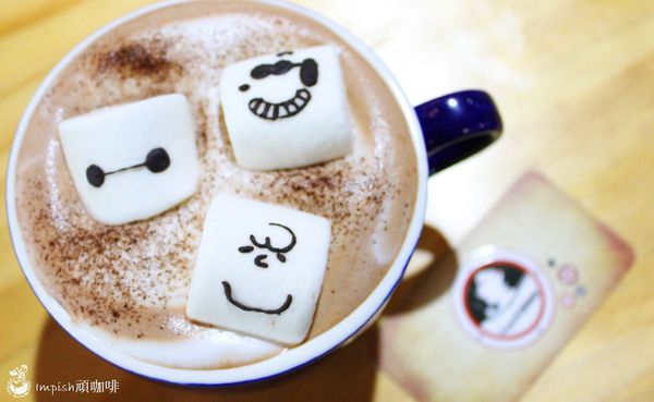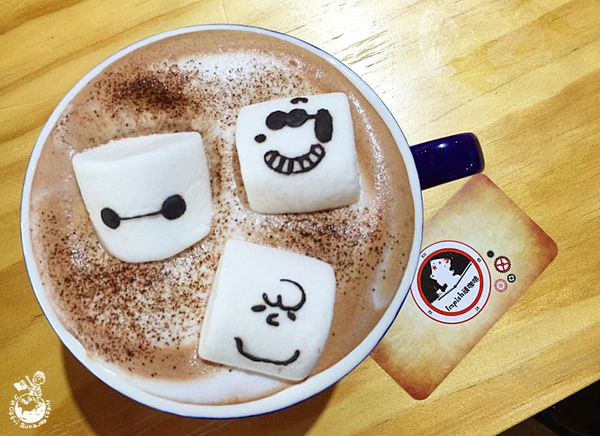 我要先特別說一下, 其實正常版的棉花糖可可只有兩朵造型棉花糖,但因為老闆娘看我青春活潑又俏皮的份上特別多給我一朵,讓我三款棉花糖一次滿足(覺得心花朵朵開)。杯麵 、 史努比和查理布朗三朵棉花糖一起飄在可可上迎接你的畫面好療癒,好捨不得拆散他們喔 (老闆娘表示︰給我趁熱喝!!!!!!!)