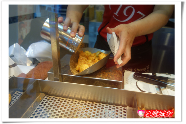 我們點的「蒜脆杏鮑菇」終於好了,新鮮杏鮑菇切成小段,裹上粉炸成金黃色,再灑上中藥調製而成的胡椒粉與香蒜粉,看起來好吸引人啊!好期待呢!