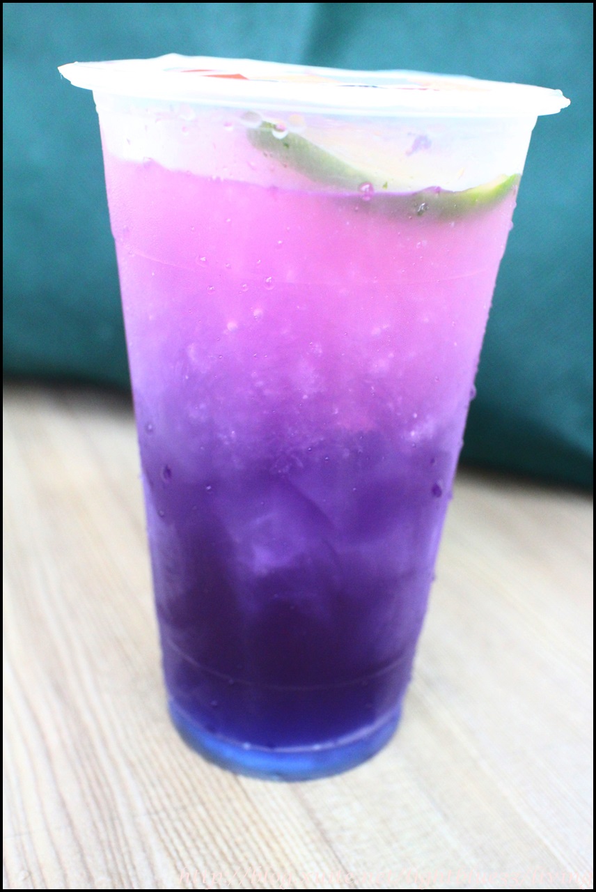 蝶豆花檸檬冰茶底層是深藍色,往上是深紫色,而最上層接觸到檸檬的地方會因為酸度而變成神秘的葡萄紫
