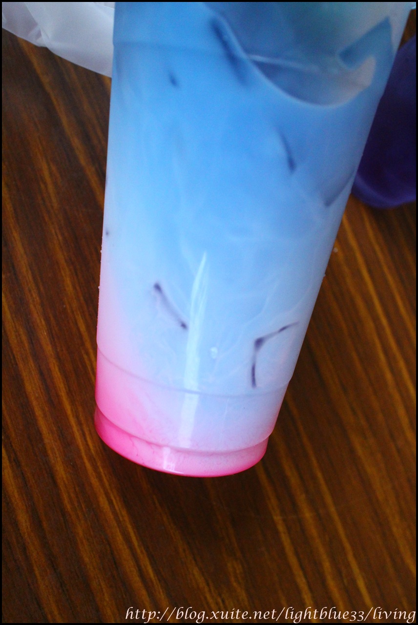 用力搖晃後就可以看到變魔術時間啦~紅白藍混合在一起變成很漂亮的芋頭紫!這杯我給朋友帶回去喝,他說喝起來像是草莓蜜豆奶,不過是三分甜的版本XD