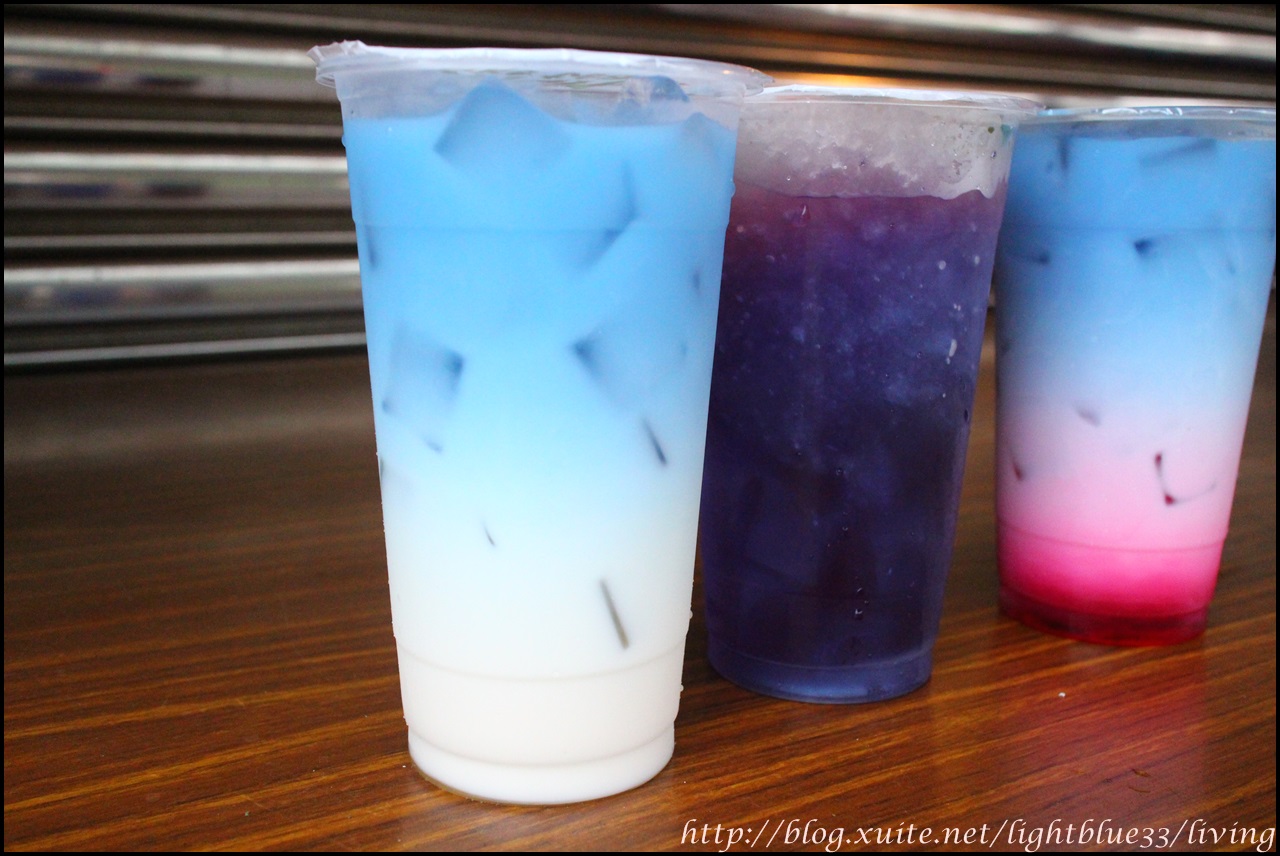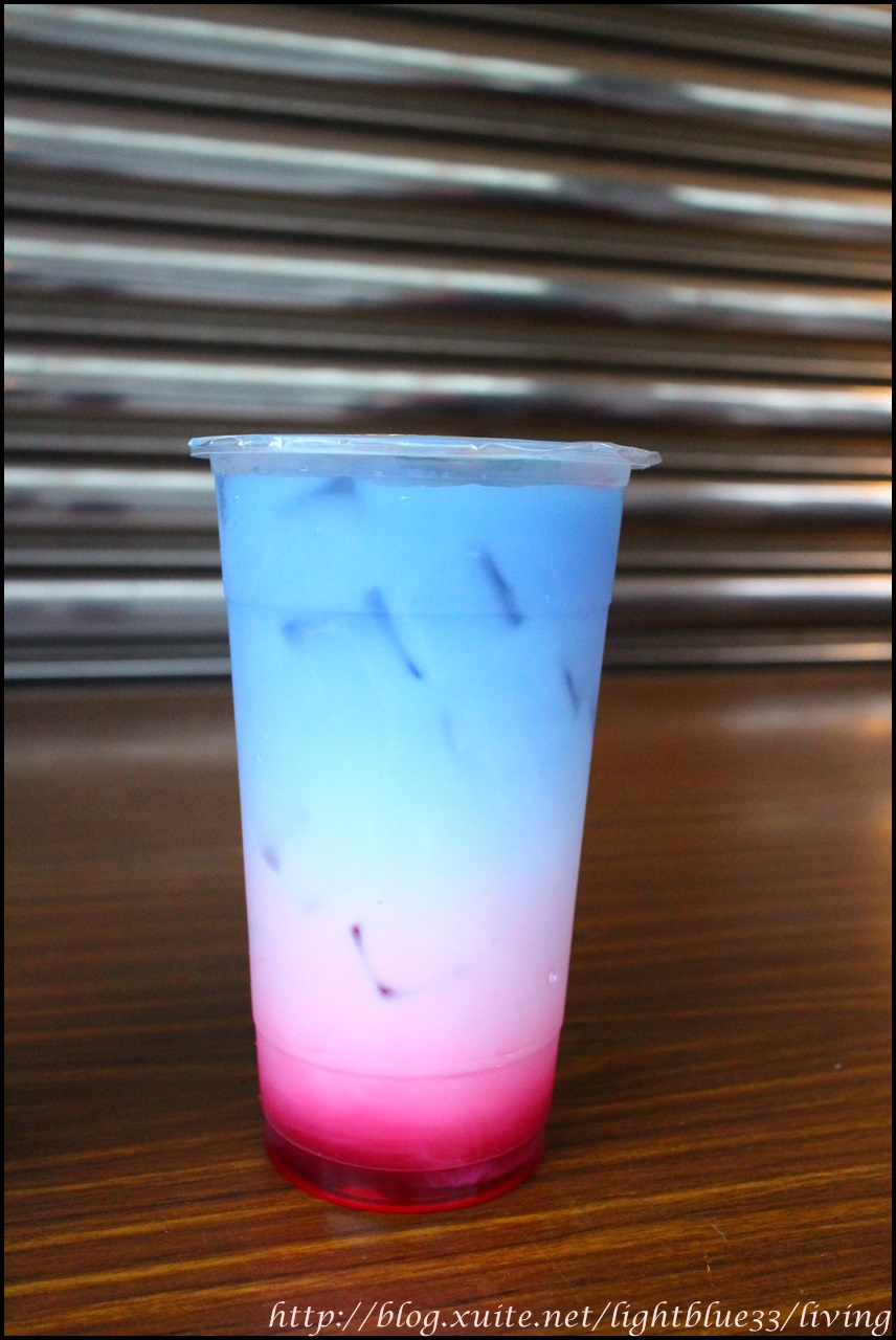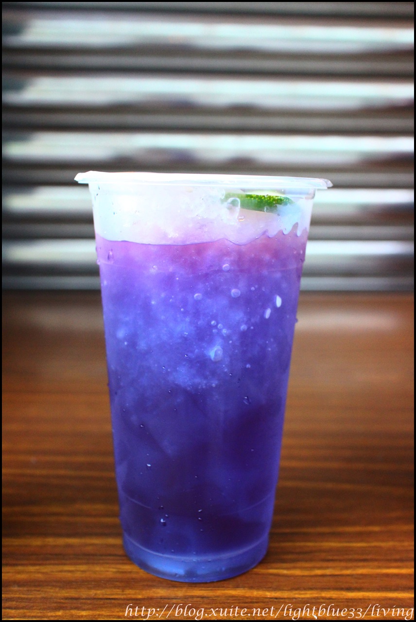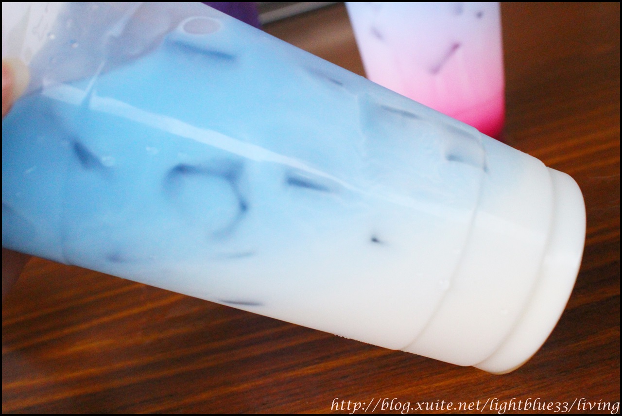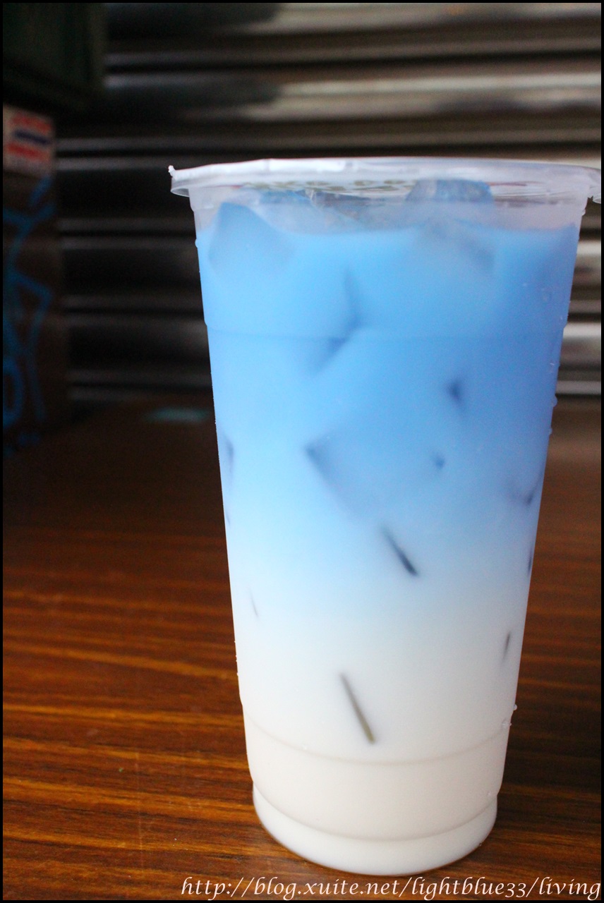 因為比重的關係,所以蝶豆花會浮在鮮奶上頭,不過老闆有特別交待,要飲用時一定要搖勻之後再喝,所以想照相的人可得抓緊時間,因為就算沒有上下搖晃,不過時間一久,藍色的蝶豆花也還是會慢慢滲到下層的