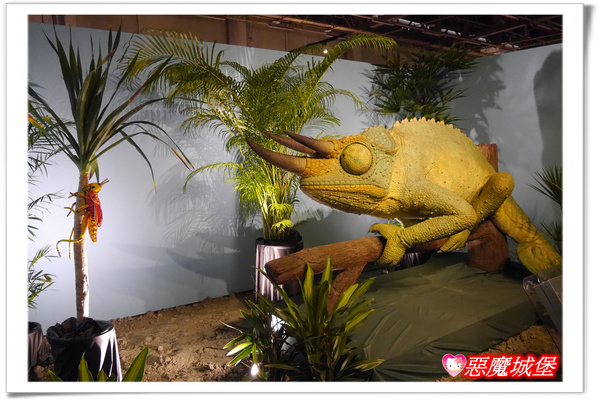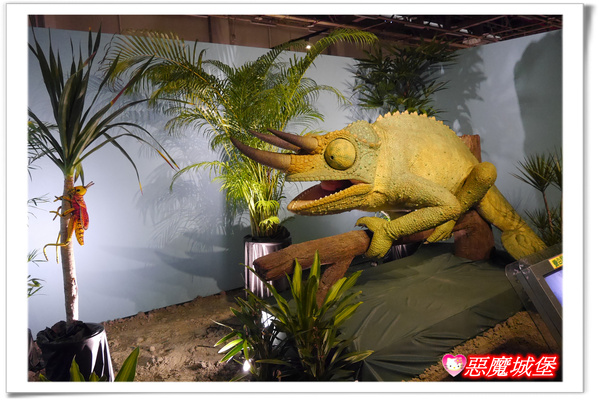 此區最後方是一隻會隨著環境而變色的「變色龍」,這裡設計了一個「變色龍」獵食的生態教育互動遊戲,只要將左右眼的指標都對準小蟲子,再按下啟動鈕,「變色龍」就會開始獵食囉!