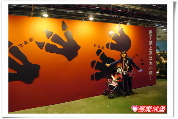還設計了一個大看板,可以跟各種不同的恐龍比身高,看看誰最高?Fiona說她最高啦!哈哈!