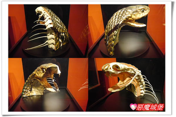 走進雨林,首先看到的是蛇的頭部模型旋轉展示,一邊是蛇的外表,另一邊則是蛇的頭骨與各種不同的毒牙構造,印象中蛇都只會吐吐舌頭,我從沒想過,原來牠們的牙齒這麼尖銳,好可怕啊!