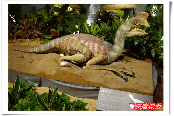 「竊蛋龍」,是肉食性動物,頭頂有一個像火雞的頭冠,嘴巴跟羽毛都很像鳥,牠是最接近鳥類的恐龍之一,原本的研究以為牠是要偷蛋,後來才發現原來那些蛋是牠們所生而且正在孵蛋,牠們背了很久的黑鍋呢!呵呵!