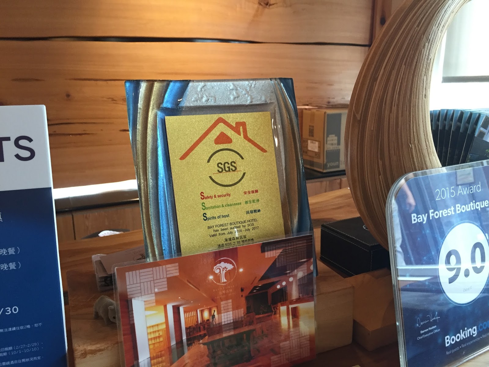 櫃台也放著通過 SGS民宿認證的標章,另外還有榮獲 2015 Booking.com 的客人評分 9.0資格。