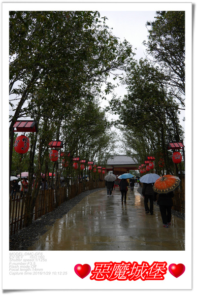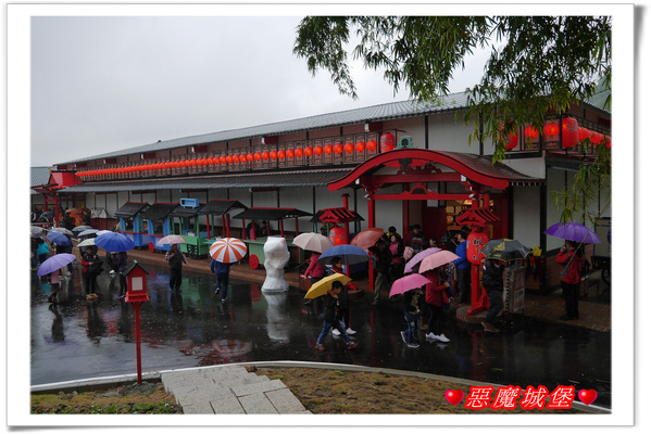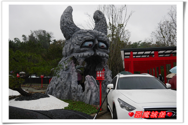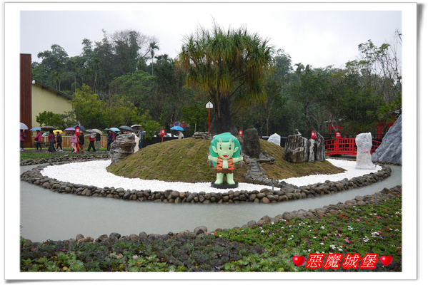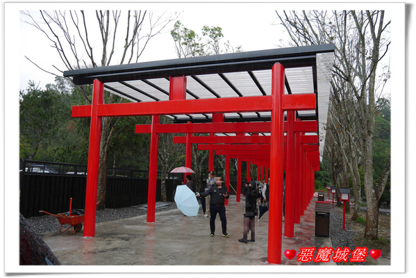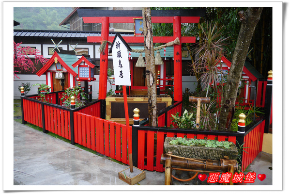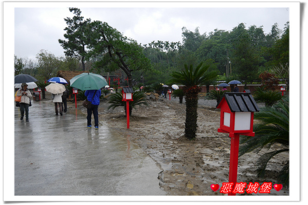 園區內設立一座大大的魔王,我想,它應該是桃太郎打的那個魔王,即使是下雨天,許多遊客還是搶著跟它合照,一旁是在日本神社常見的鳥居,裡頭聚集了不少人,下雨天它就變成另類的遮雨棚了,呵呵!