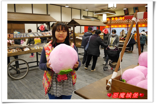 賣場裡頭伴手禮真不少,茶、餅乾、糖果、毛巾、浴巾.....吃喝玩樂應有盡有,不過我覺得其中最吸睛的還是Fiona手上的大桃子啦!