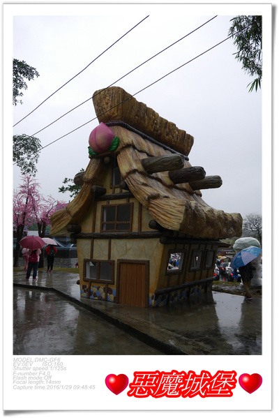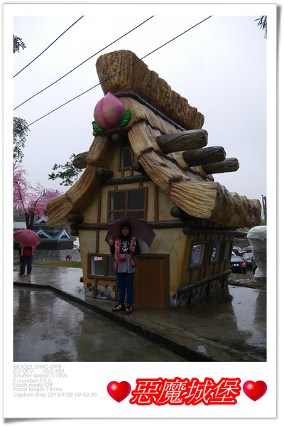 這棟有著桃子標誌的合掌屋,應該是象徵桃太郎的住家,門口還有老爺爺與老奶奶的大公仔,可惜下雨被袋子罩住了,這房屋可是「台灣影城之桃太郎村」的一大亮點喔!