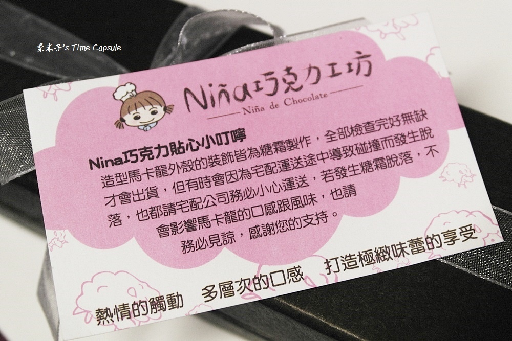 內盒一樣有印著妮娜娃娃的紙張隔開了馬卡龍和盒蓋的接觸,