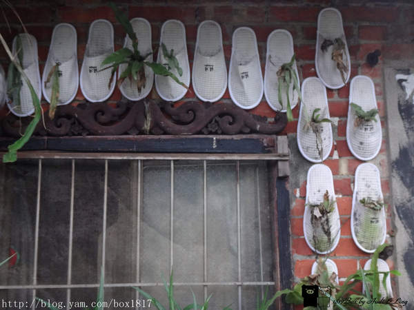 金瓜石土雞城隔壁牆上掛滿了紙拖鞋,拖鞋裡還有綠色植物,真是另類的裝置。