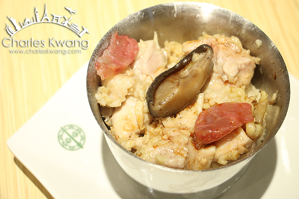 上桌後,服務人員再淋上再淋上特製醬油,切成碎丁狀的蜜味叉燒,包在潔白滑嫩的腸粉裏,還不錯吃。臘腸北菇雞飯/Rice with Chicken,Sausage and Mushroom