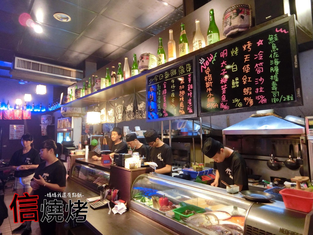 店裡頭帶點日式居酒屋的氣氛,吧台也放上了新鮮魚貨