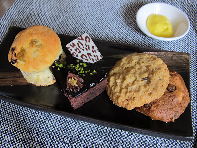 剛抵達飯店時,由於房間尚未整理好,先招待我們到衛斯理西餐廳享用下午茶,可任選咖啡或紅茶,以及一份包含著司康、餅乾以及綴著綠色開心果的巧克力蛋糕,細緻的點上開心果的蛋糕,讓我直覺聯想到奧地利的莫札特甜點。