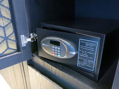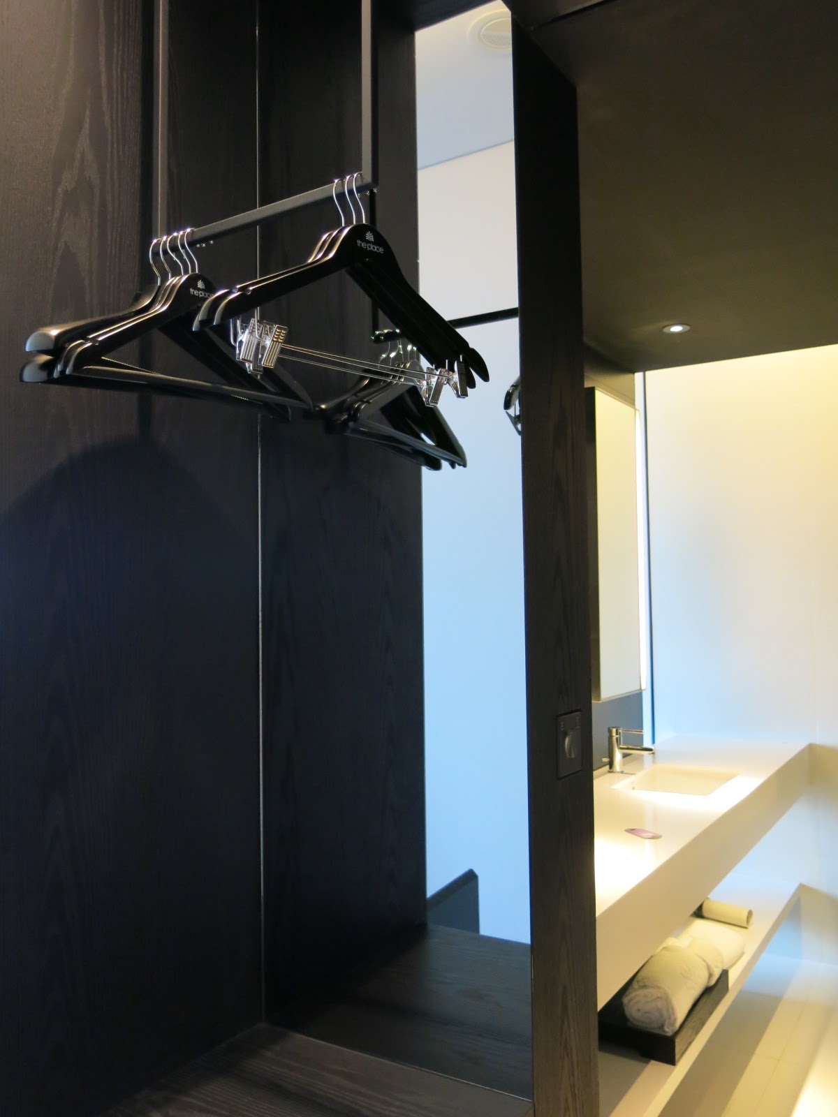 浴室及廁所就在一進門的右側開口,首先見到開放式的衣櫥,衣櫥下有個實用的保險櫃,進入浴室長條雪白的洗手台在眼前展開,一樣黑白風格的簡約俐落,偌大的人造石檯面非常好用,牆面上有隱藏式的收納櫃,盥洗用品一絲不苟的收納在裏頭。