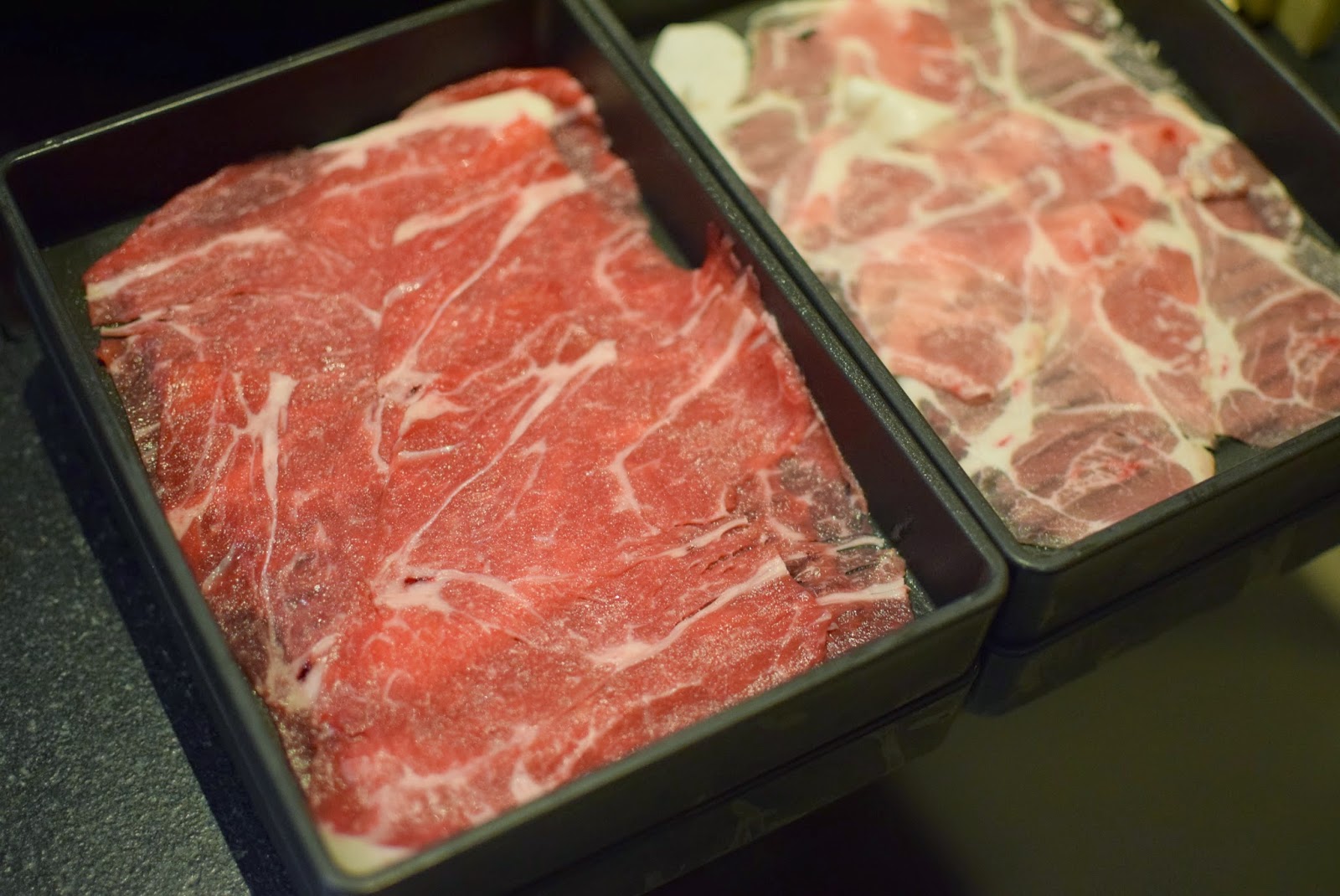 涮涮鍋的主角是美國頂級霜降牛與美國頂級極黑牛,各兩盤就率先上桌,然後用餐期間服務人員會不時詢問,是否還要再追加肉類,服務相當周到。