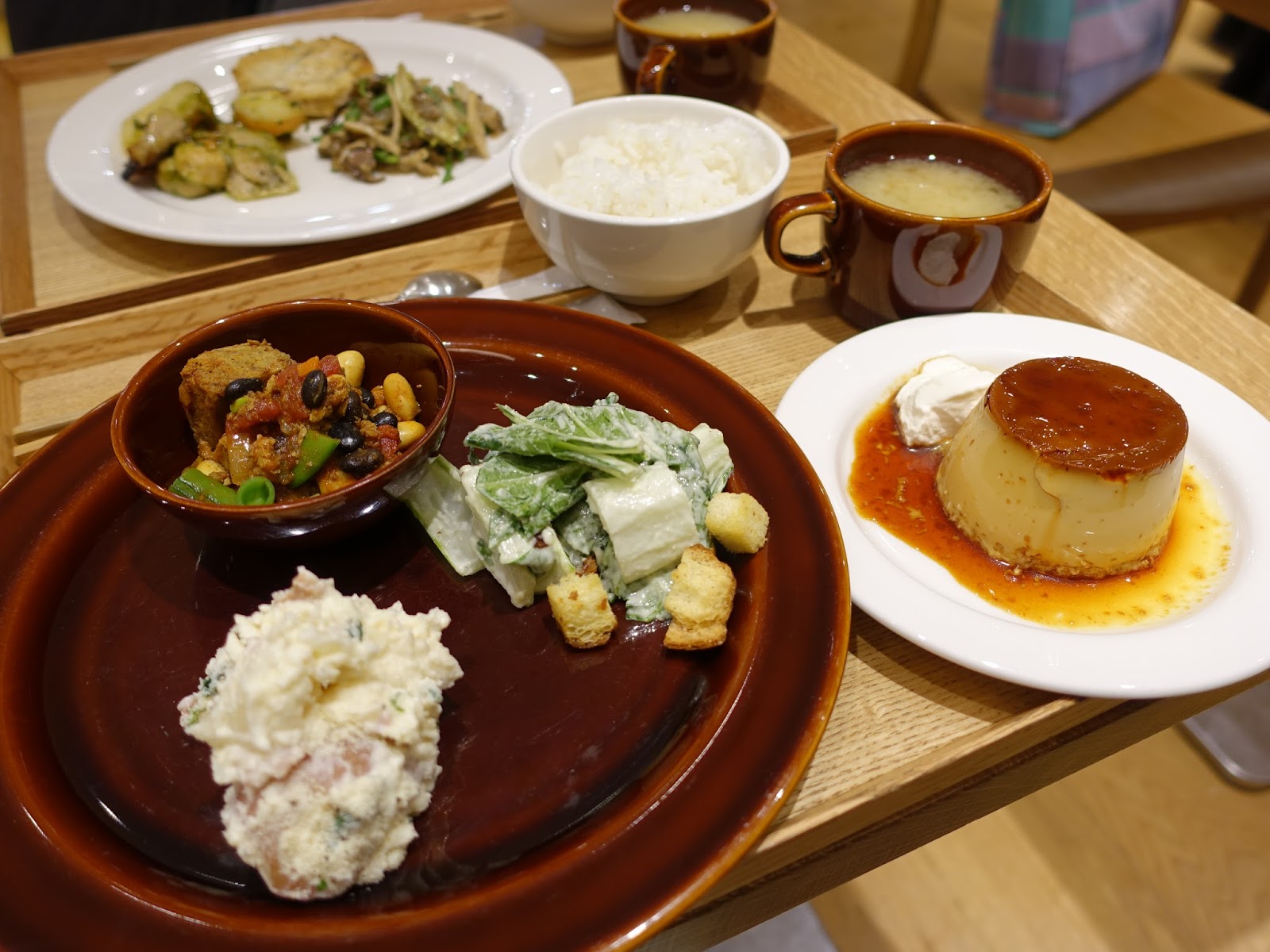 通常大家都選擇三品或四品的菜色,加上一碗白飯、一碗味增湯,三品可自由選擇熱食或冷食,每一份菜份量看起來不多,但吃完很有飽足感。菜餚都是很樸實的家常菜或沙拉,沒有華麗的驚艷感,但吃起來每樣菜色食材都相當新鮮,以少油低鹽的方式烹調,連味增湯的都不會太鹹,相較印象中的日本菜鹹度低很多,吃起來較無負擔。