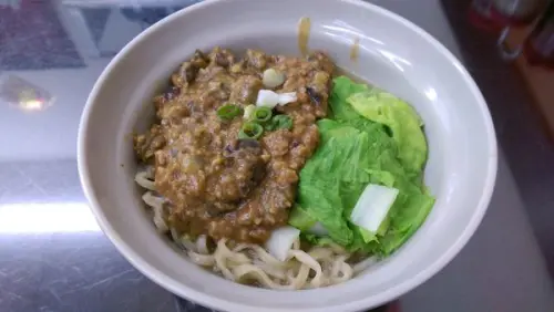 除了雞肉以外,還有脆麵、高麗菜絲、蔥、洋蔥,獨門調製的高湯醬汁更是挑動味蕾,很難具體形容出這個高湯醬汁是融入什麼食材,但是絕對是一般乾麵醬汁吃不到的味道。