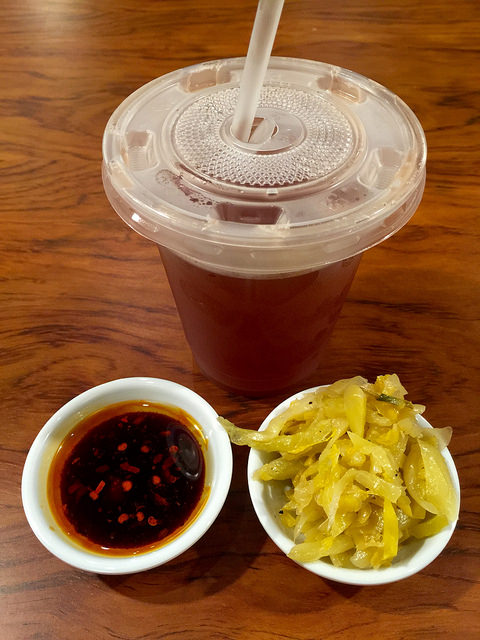 酸菜單吃不怎麼樣而且略帶花椒苦味, 但加到牛肉麵後竟然變得嘟嘟好 XDD倒是手工洛神花酸梅湯超好喝的呀呀呀~~~~