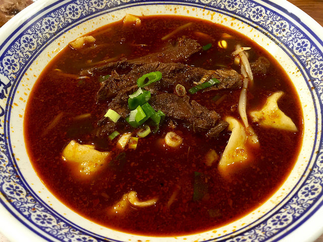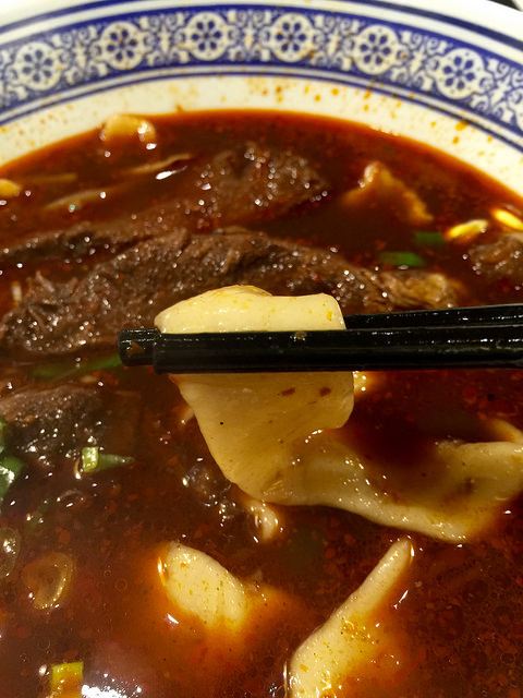 另一碗點的是老火鍋麻辣牛肉麵, 上面同樣有三大塊牛腩肉. 老火鍋麻辣湯底比辣味紅燒更加帶勁, 濃濃的花椒跟辣油香氣滿分, 個人覺得這簡直可以帶回家煮麻辣鍋了啊~~~~~