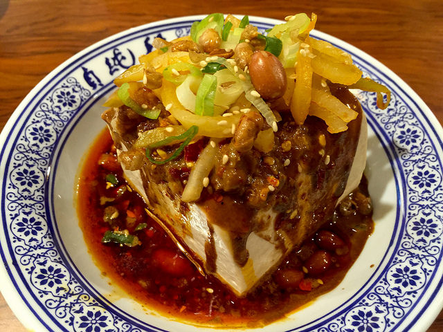 澆汁豆腐, 醬料跟紅油抄手有點類似但又有些許的不同, 同樣帶有濃厚椒麻風味但多了點什麼醬我也說不上來, 不知道是不是芝麻醬之類的. 下面則是一大塊比拳頭還大的厚實老豆腐.