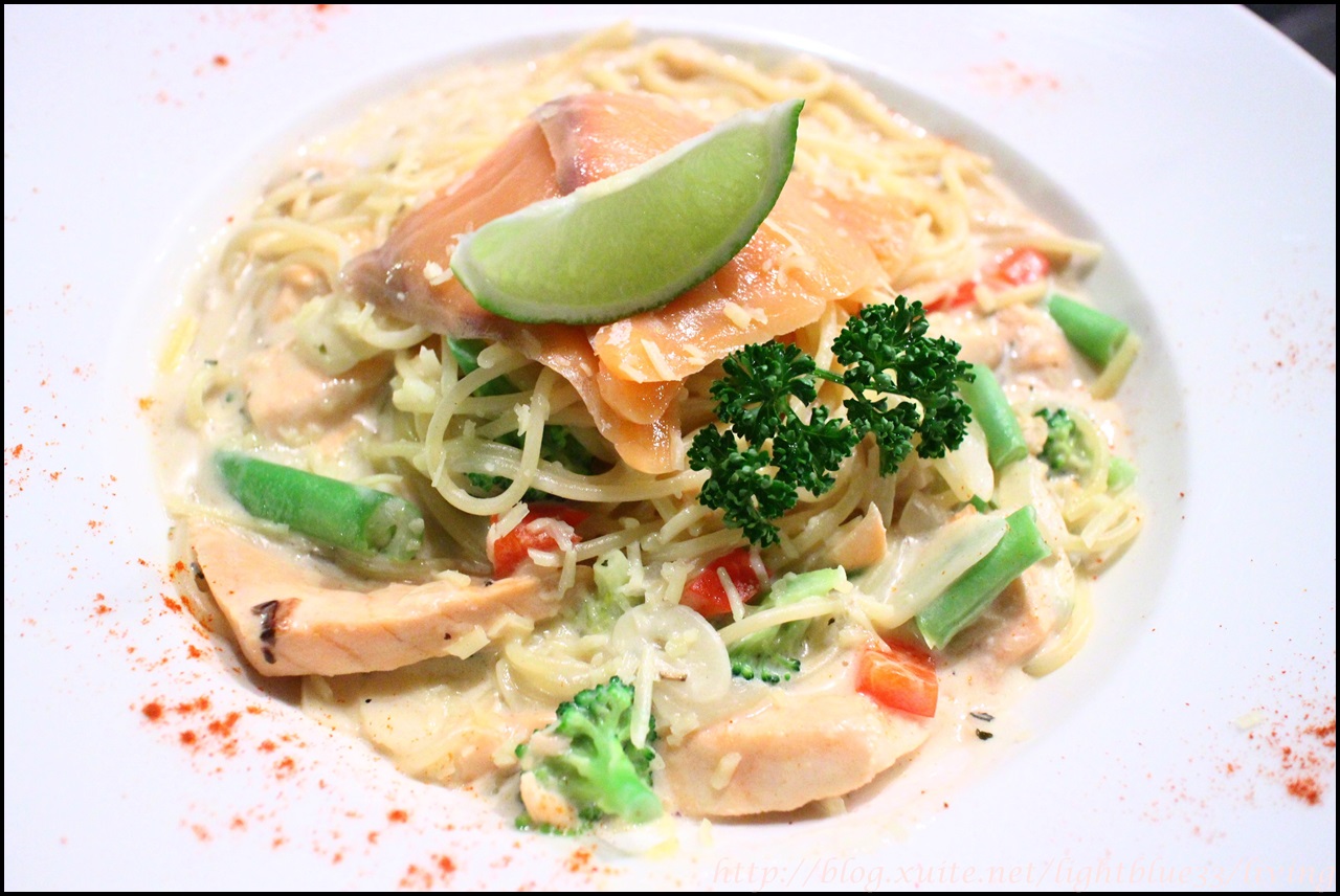 吃了這麼多開胃菜,我不只開胃,根本就已經快飽了,可是每一道都好好吃,實在捨不得只吃一點點啊~就在這時主菜上桌了,這是奶油起司煙燻鮭魚義大利麵,看到有多少鮭魚了嗎?papa rice用料真的都很實在又大方耶,小鳥胃的女生說不定光吃這一盤就會飽得吃不下別的了呢