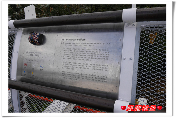 橋上扶手部分有象徵排灣族的百步蛇圖騰,有注意到嗎?上方白色菱形,是百步蛇的頭部,上頭穿了2個孔,是百步蛇的眼睛,彎彎的支撐條有一個個偏咖啡色的菱形圖樣,是百步蛇的身體,仔細瞧瞧是不是很像百步蛇呢?一隻隻百步蛇正在守護著通過吊橋的遊客們,我覺得這個設計真的是太棒了!
