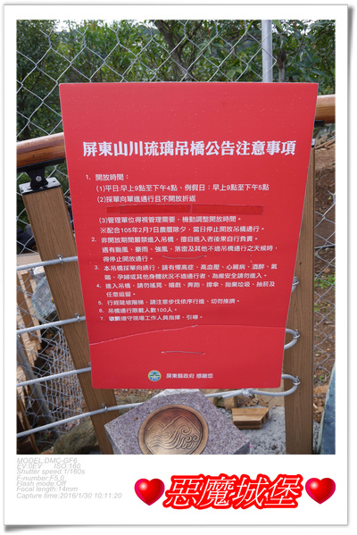 南部遊第二天,首站來到104年12月26日才剛開放的「屏東山川琉璃吊橋」,這座橋現在真的超夯,我看新聞報導假日的時候都要排隊排很久才能上橋,尤其在105年2月29日之前可以不收門票免費參訪,更是吸引了大批慕名而來的人潮,我們難得來到南部玩樂,當然不能錯過這個美麗的景點囉!