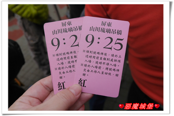 我們不知道是太幸運?還是到的時間太早?或是天氣不好的關係?總之今天遊客不多,完全不用排隊就能拿到號碼牌,而且拿到的還是9:25,等於是立刻就可以排隊進吊橋了耶!哈哈哈.....