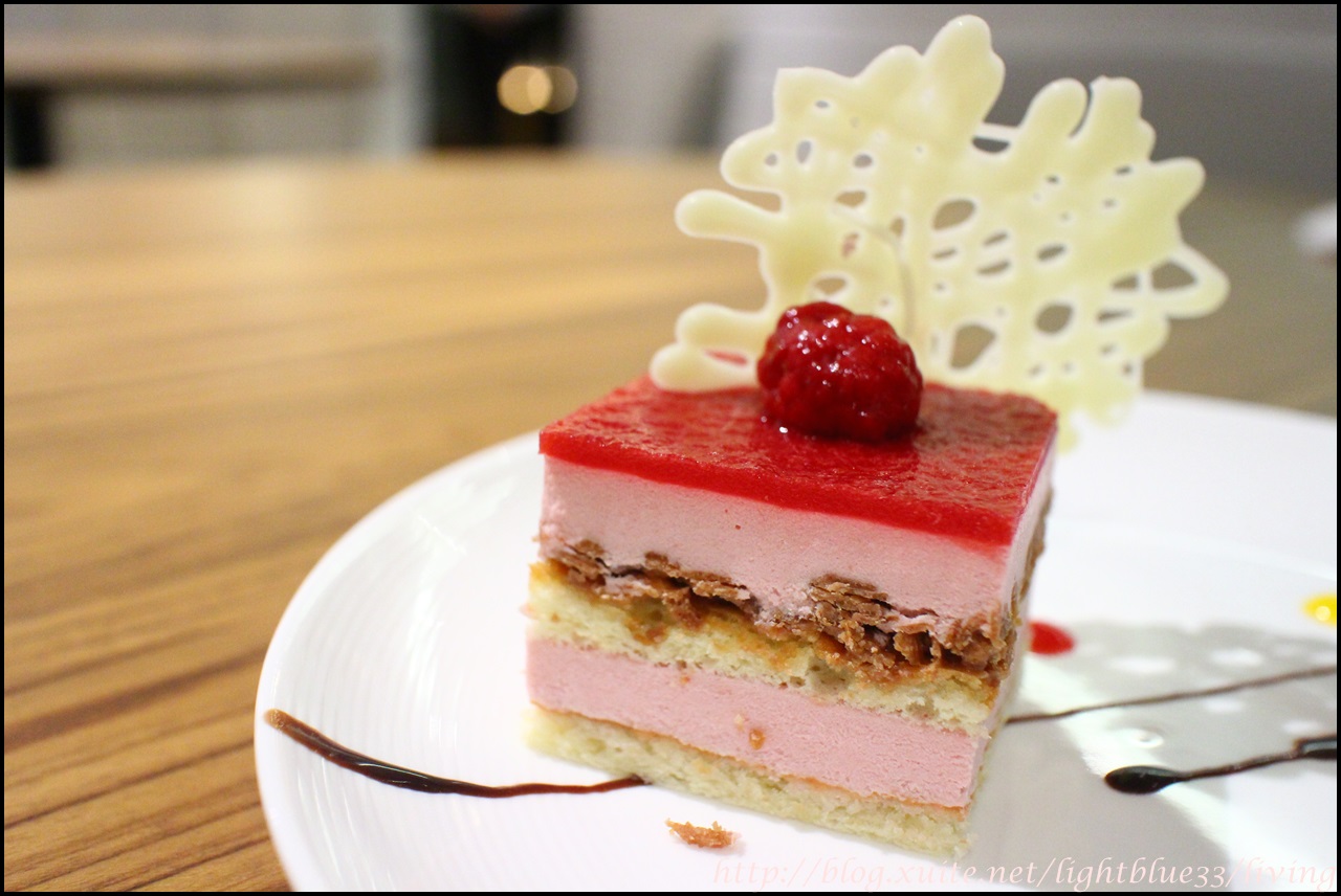 最上層的覆盆莓果凍是主要酸度來源,所以建議吃的時候要垂直切下,把所有層次一同入口品嚐