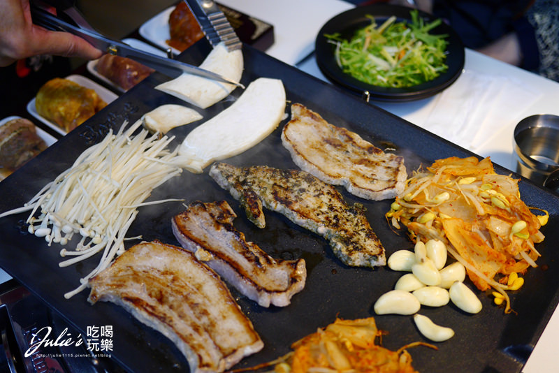 ↑這個擺法很道地,在韓國吃烤五花肉也都是把泡菜放在鐵板上。