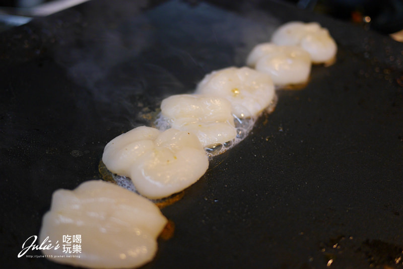 ↑把鐵板清乾淨之後,放下鍋去煎~干貝會稍微縮水一點點。