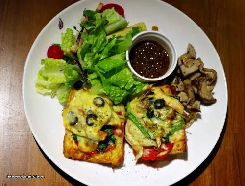 ↑佛卡夏麵包本身就有香料的香氣,在搭配上青醬蘑菇醬,根本就像是小披薩!