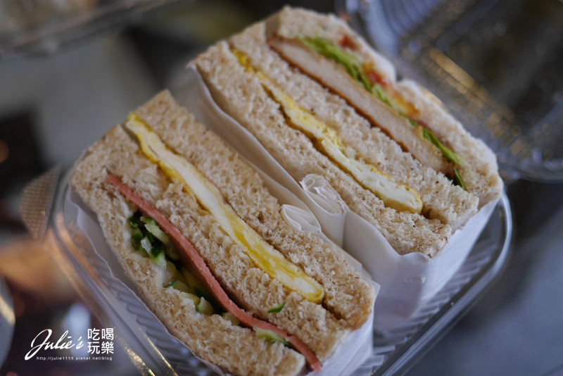 ↑這個看起來應該是布里歐吐司做的三明治,上下兩個口味用的都是素火腿,所以吃素的朋友也可以吃喔!