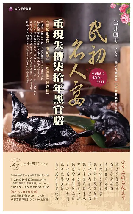 台北四七名人宴為了此次民初名人宴,精心策劃令賓客重返民國初年的風華歲月。