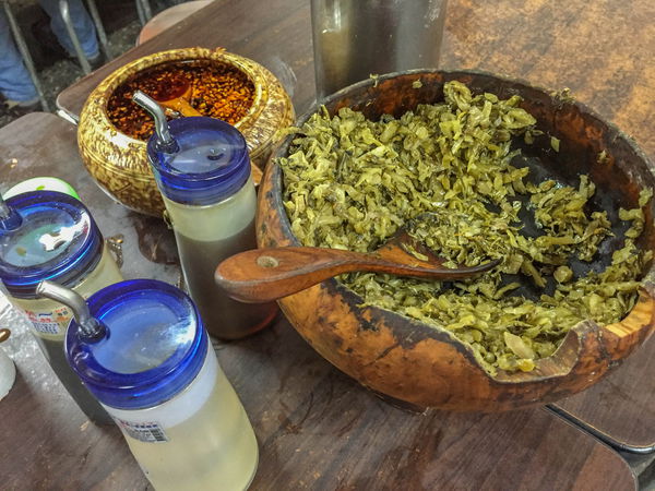桌上的調味料,其實我覺得用木盆來裝盛物品還蠻可怕的,看看那歲月的痕跡....