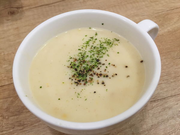 A套餐附的玉米濃湯調味淡近如水,大蒜麵包鬆軟熱乎相當開胃,但飲料才是讓人意外之處;