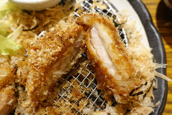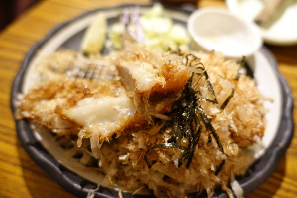 有白飯和味噌湯基本配備,還有被柴魚片鋪滿的主食豬排啦!!!!