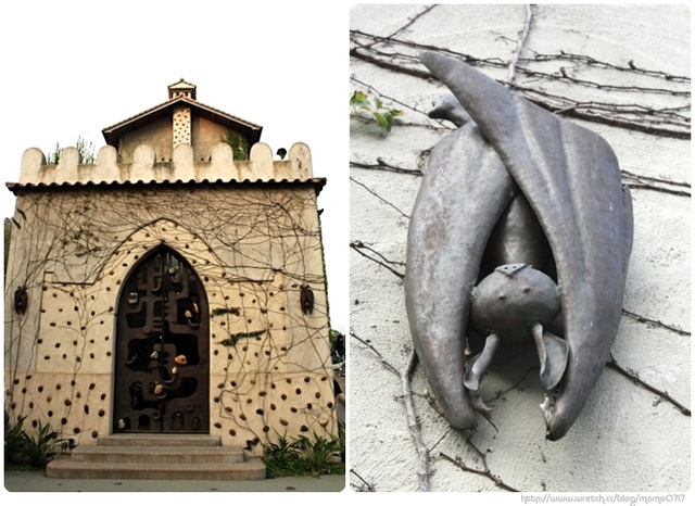 仔細看城堡側邊的牆上,懸掛著銅鐵製的蝙蝠耶!