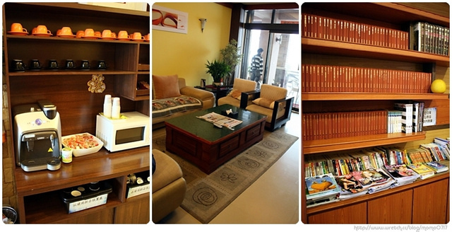 都要走了,才發現1F的大廳比昨天匆匆進房印象中來得舒適,頗多書籍的,還有咖啡可以喝耶!