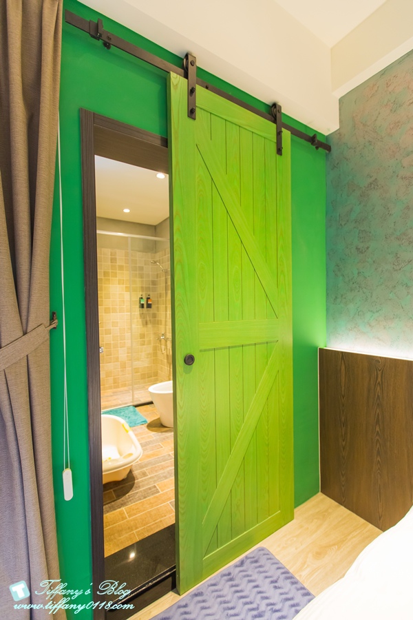 尤其是牆壁利用特殊漆所漆出來的顏色搭配浴室木門的顏色